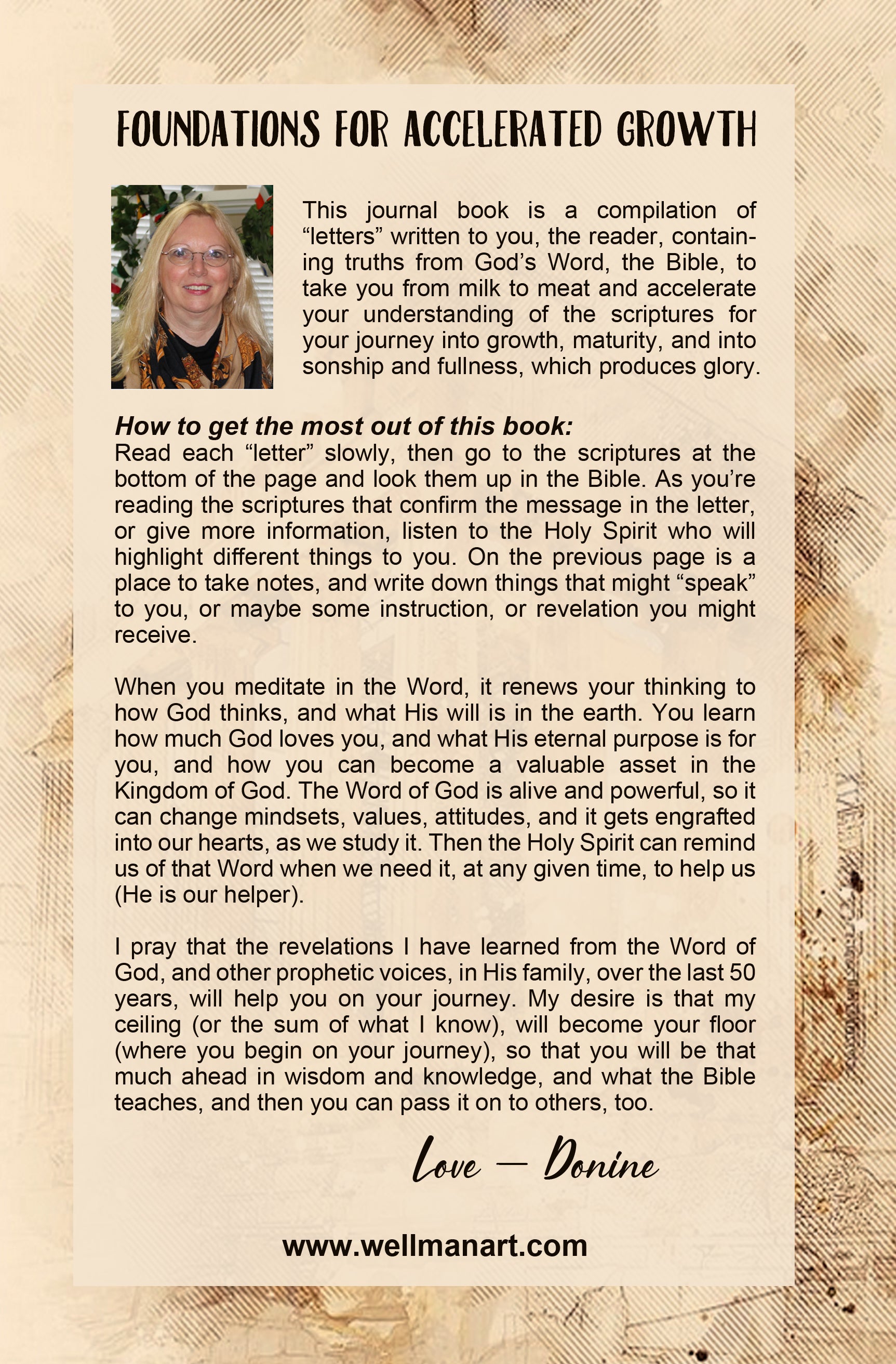 Donine has just released a brand-new devotional journal book titled “Foundations for Accelerated Growth.” This devotional includes 30 heartfelt letters written in a simple, easy-to-read format that takes you from the milk to the meat of God’s Word — helping you grow and mature in your walk with Christ. Each letter includes scripture references to look up and a place to jot down your own notes and reflections.The book begins with understanding what it means to be born of God and ends with a powerful letter on blessing Israel. Copies are available in both hard copy and digital download. Get your copy today. These are great gifts and a good way to spread the Gospel, too.