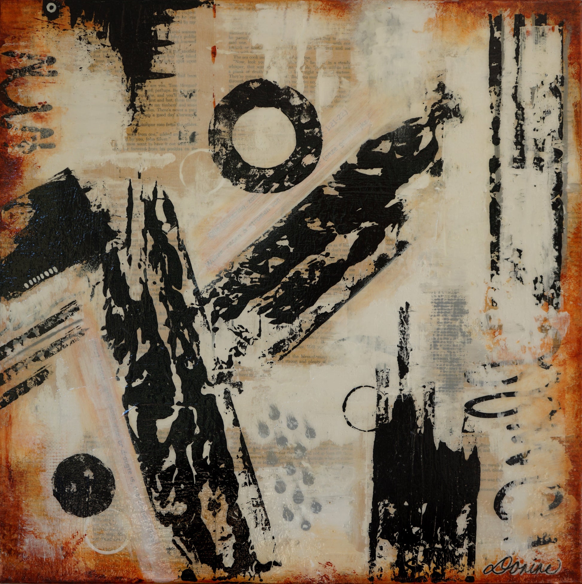 This vibrant original painting is 20" x 20" x1.5", acrylic on canvas with collage papers from "Treasure Island" book and other hidden ephemera. It's gloss finish makes it bright and cheery.